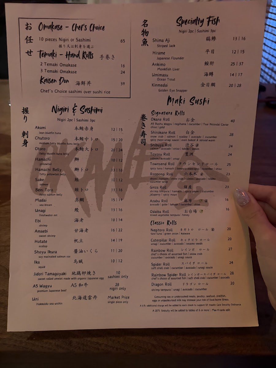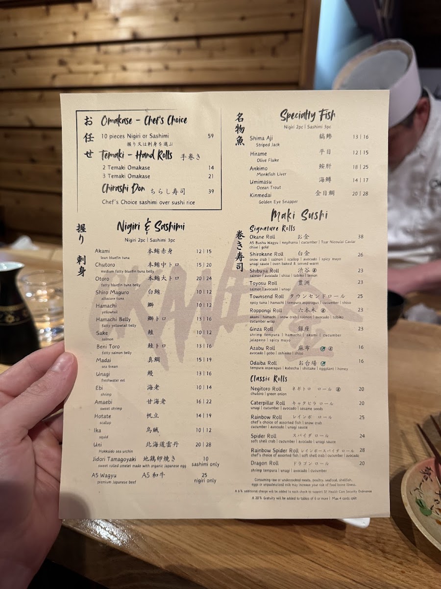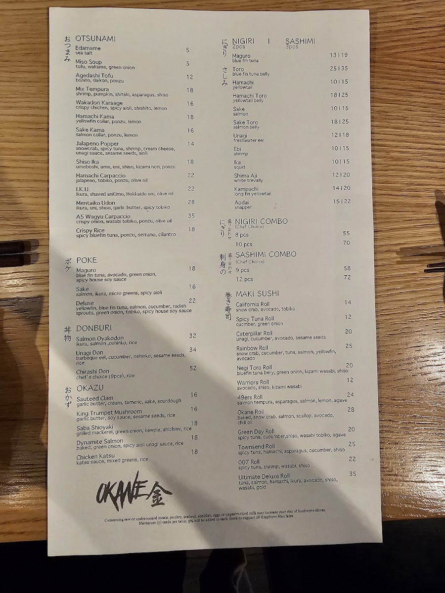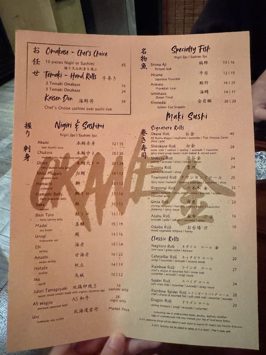 Overall, Okane’s menu offers a diverse array of dishes at reasonable prices, ranging from the casual Spicy Tuna Roll and Rainbow Roll to the more complex A5 Wagyu Tataki and OToro Sashimi. Whether you're in the mood for sushi, sashimi, or a full meal, Okane San Francisco delivers a memorable dining experience that blends quality ingredients and expert preparation.