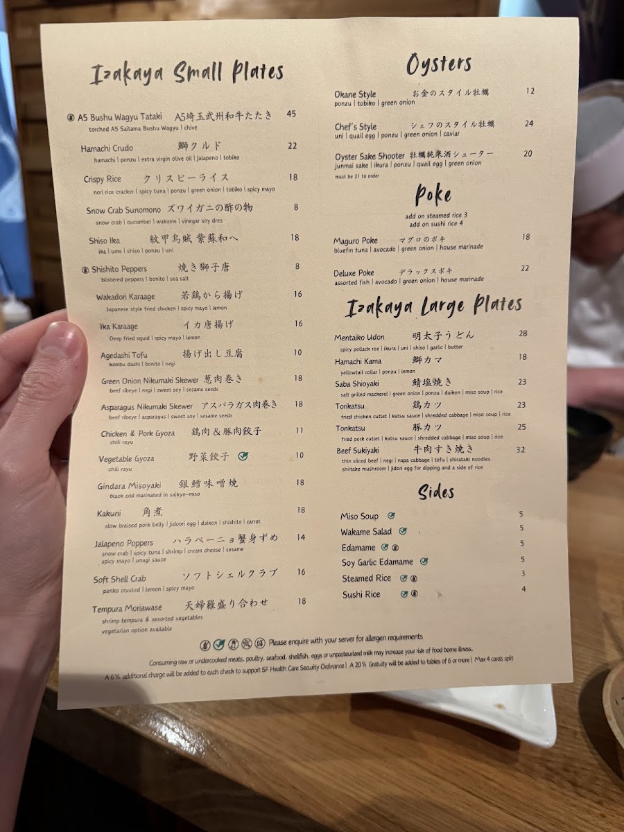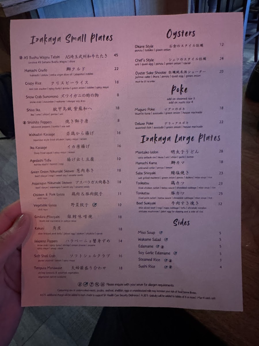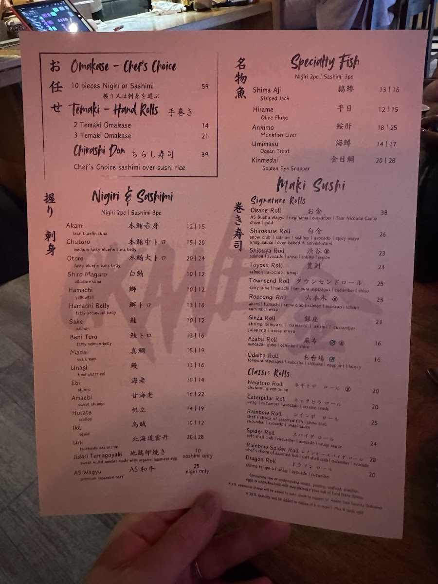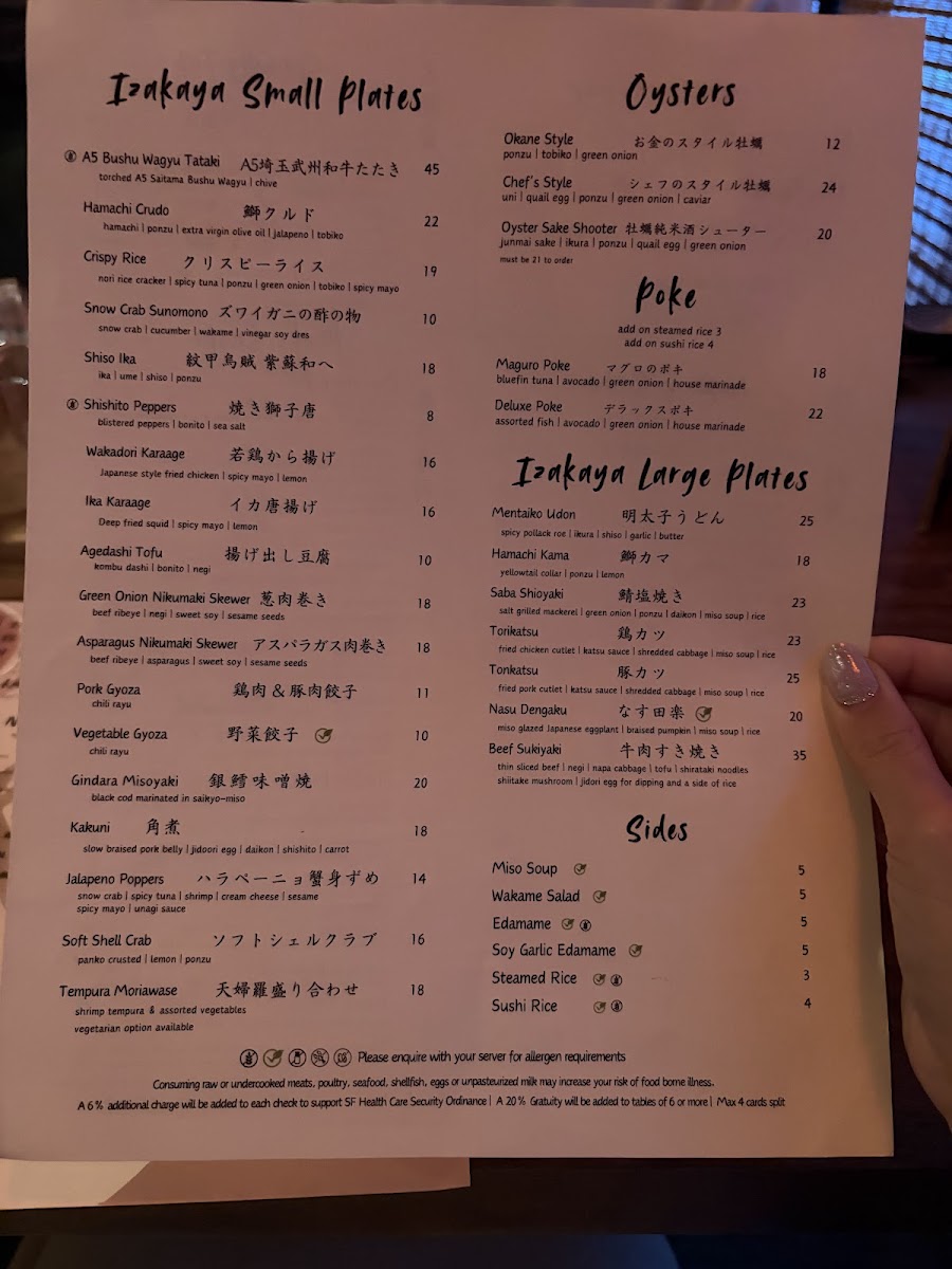 Overall, Okane’s menu offers a diverse array of dishes at reasonable prices, ranging from the casual Spicy Tuna Roll and Rainbow Roll to the more complex A5 Wagyu Tataki and OToro Sashimi. Whether you're in the mood for sushi, sashimi, or a full meal, Okane San Francisco delivers a memorable dining experience that blends quality ingredients and expert preparation.